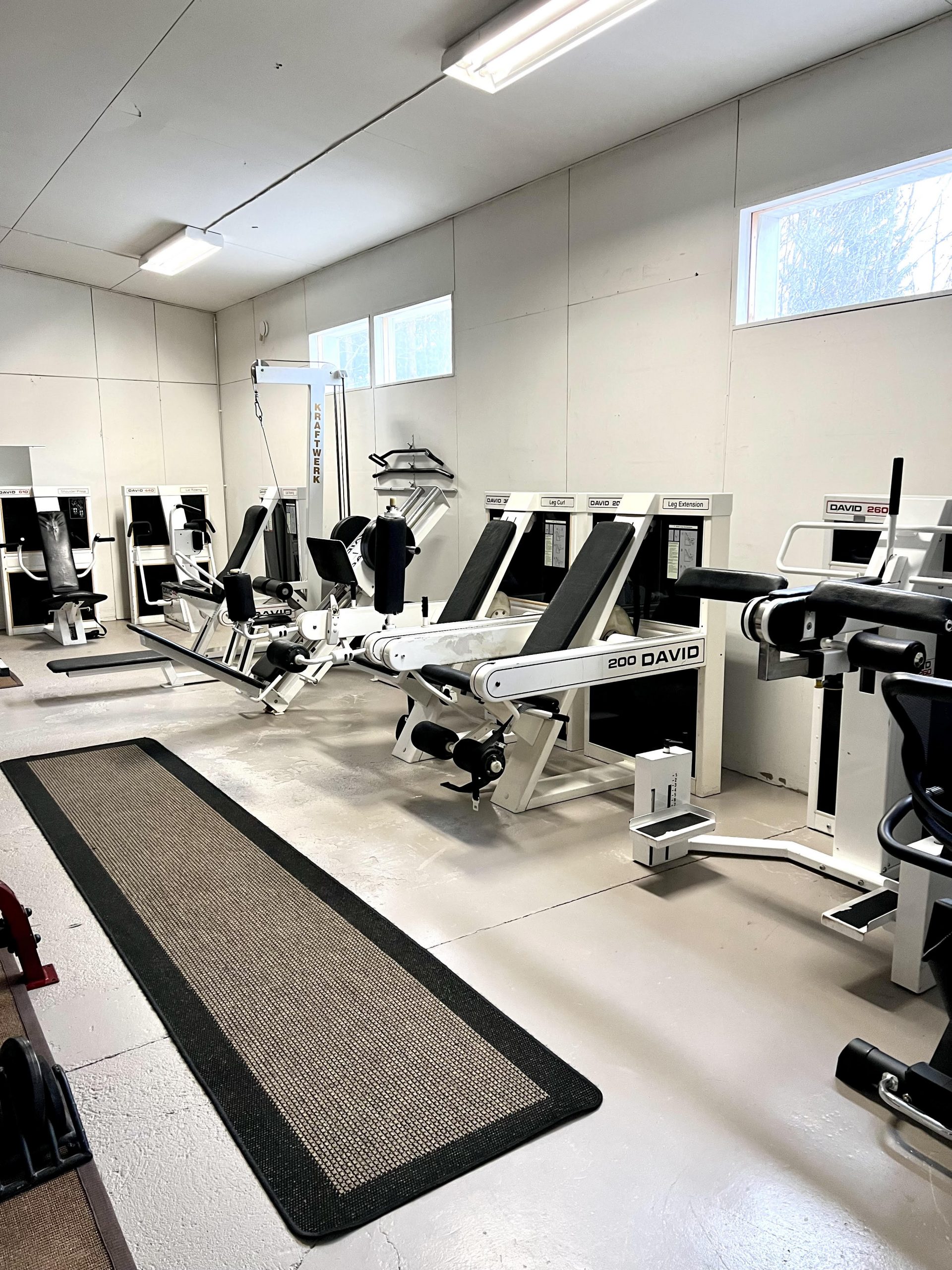 Salilla jalkojen ojennus-, koukistus- ja pakaralaitteet, jalkaprässi, olkapäälaite x 2, pec deck, kulmasoutu- ja vatsarutistuslaite, ylä-, ala- ja ristikkäistalja, penkkipunnerrus, kyykky-/leuanvetoteine, dippiteline, vinopenkki, hauistanko, käsipainoja, kahvakuulia, hyppynaruja, kuntopallo, jumppapallo, puinen hyppybox